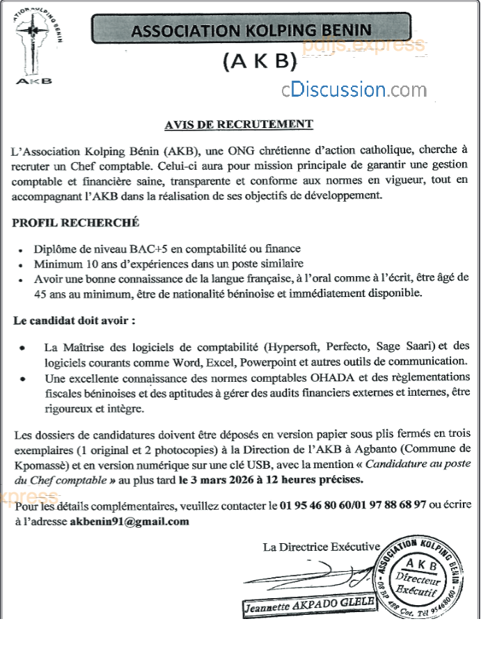 AVIS DE RECRUTEMENT D'UN CHEF COMPTABLE