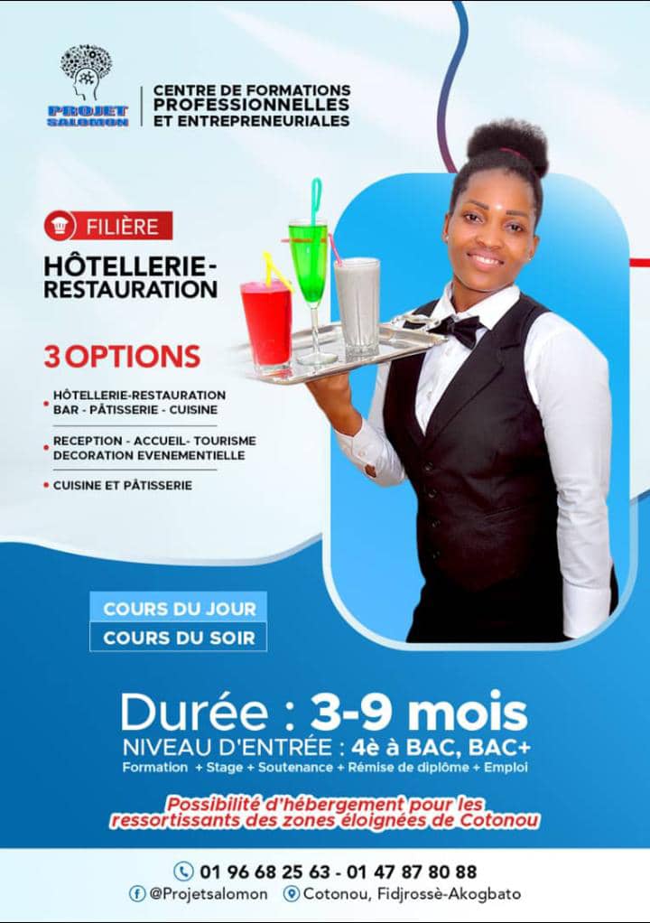🔥🔥🔥🔥🔥🔥🔥🔥Vous avez le niveau de 4e, 3e, BEPC ou BAC et vous désirez vous faire former en HÔTELLERIE RESTAURATION CUISINE PÂTISSERIE et avoir votre attestation et vos diplômes, plus de soucis.
